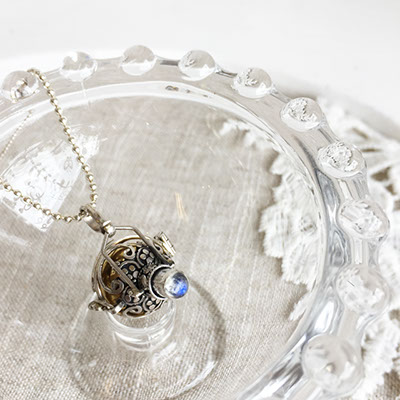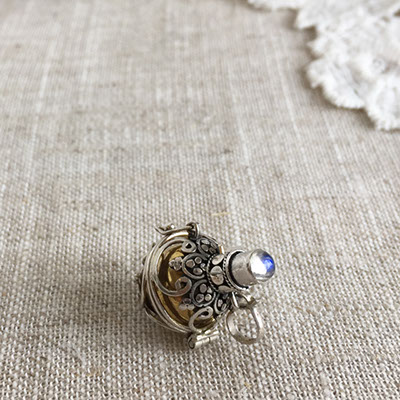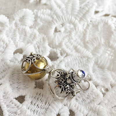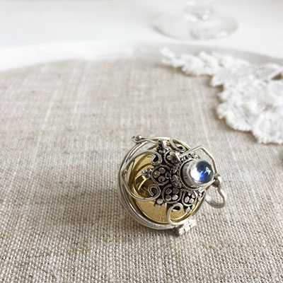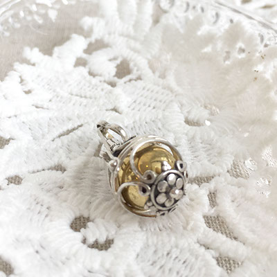 一本の銀線をペンチで曲げながら球体のバスケットを生み出すのは、まさに職人技。中から見える金色のガムランボール本体がキラキラと輝いて、美しいデザインです。